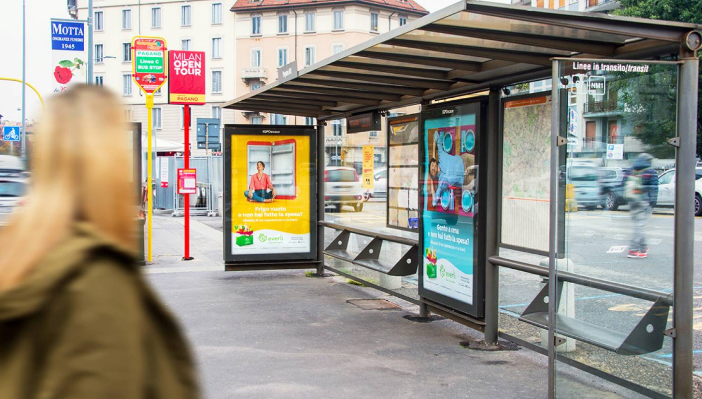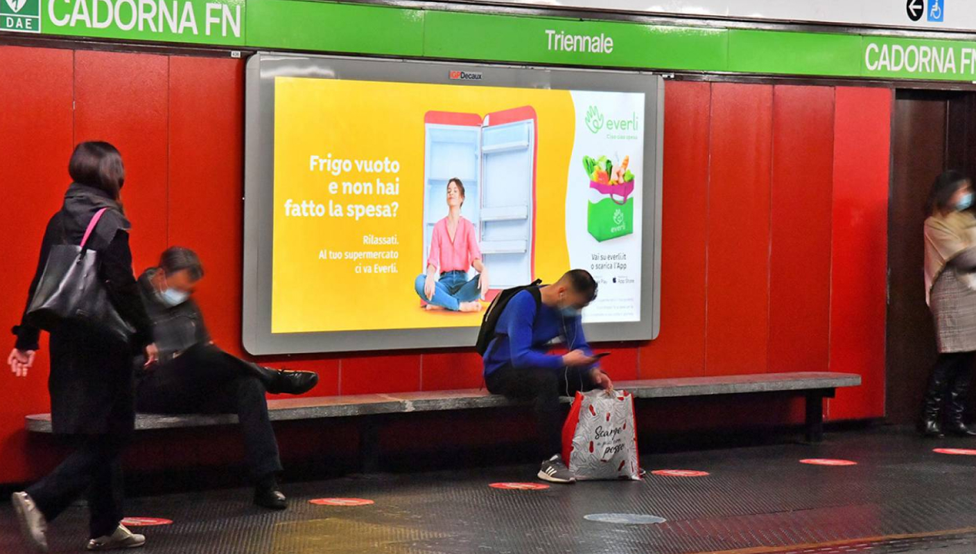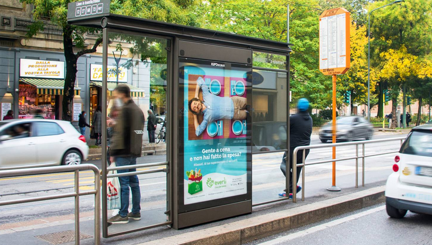 IGPDecaux tells Italian cities about the innovative service of Everli, the Shopper who delivers groceries to your doorstep directly from your online order in your favourite supermarket. The Out of Home campaign involves a truly rich media mix, capable of intercepting both pedestrians and motorists in the city, as well as passengers in transit on the underground. Thanks to the extensive media planning, the advertising conquers multiple urban centres, just as the Everli service reaches new cities every day.