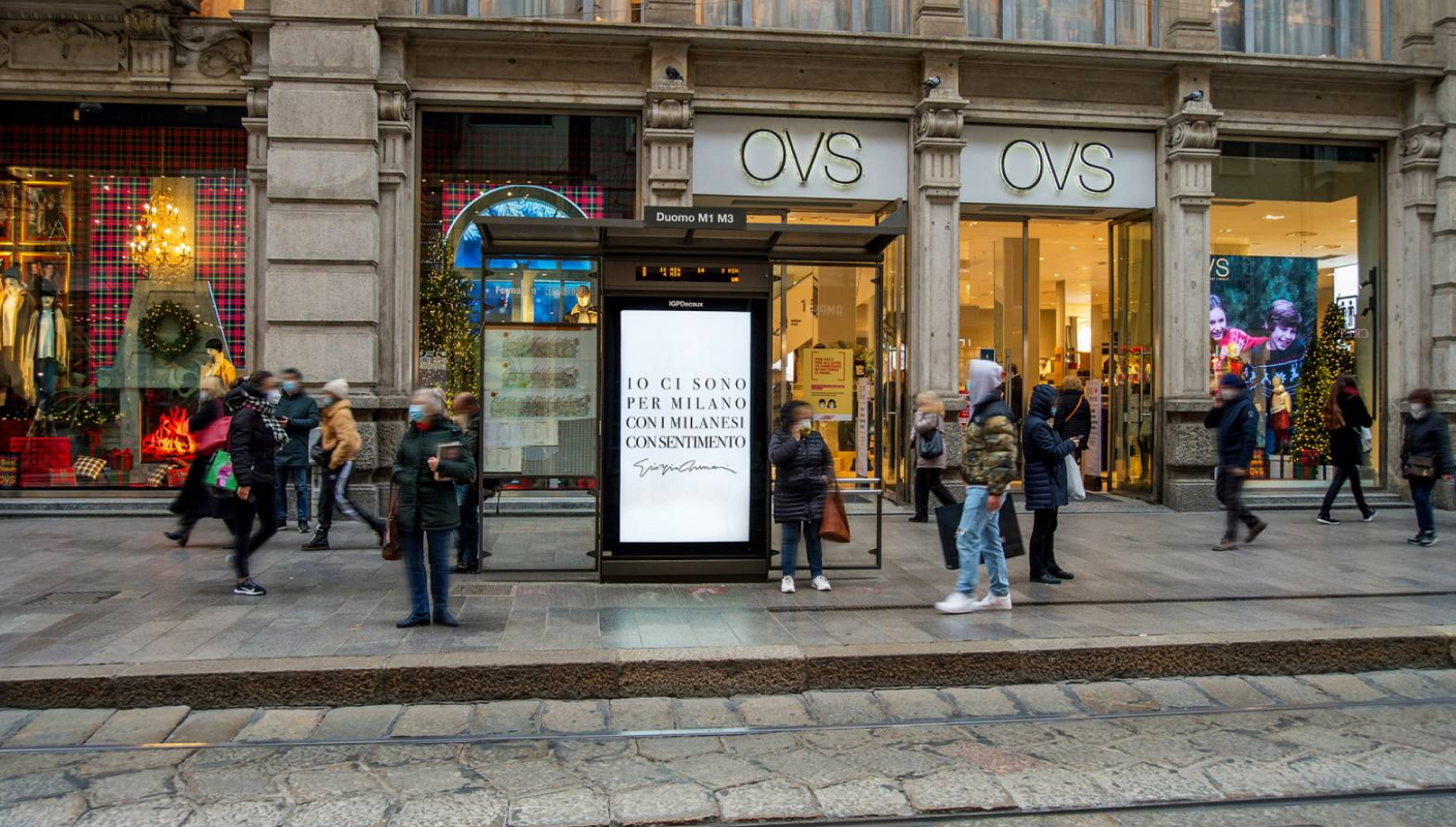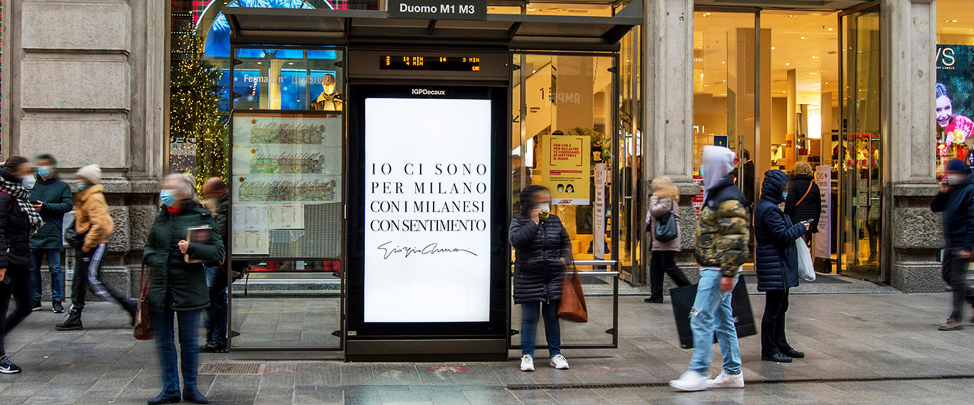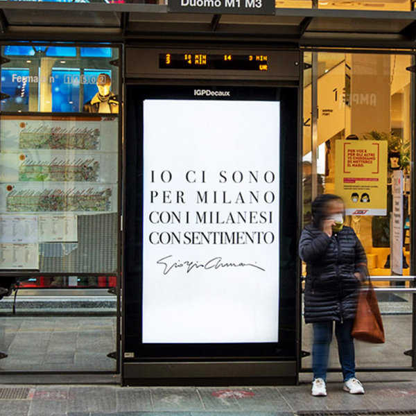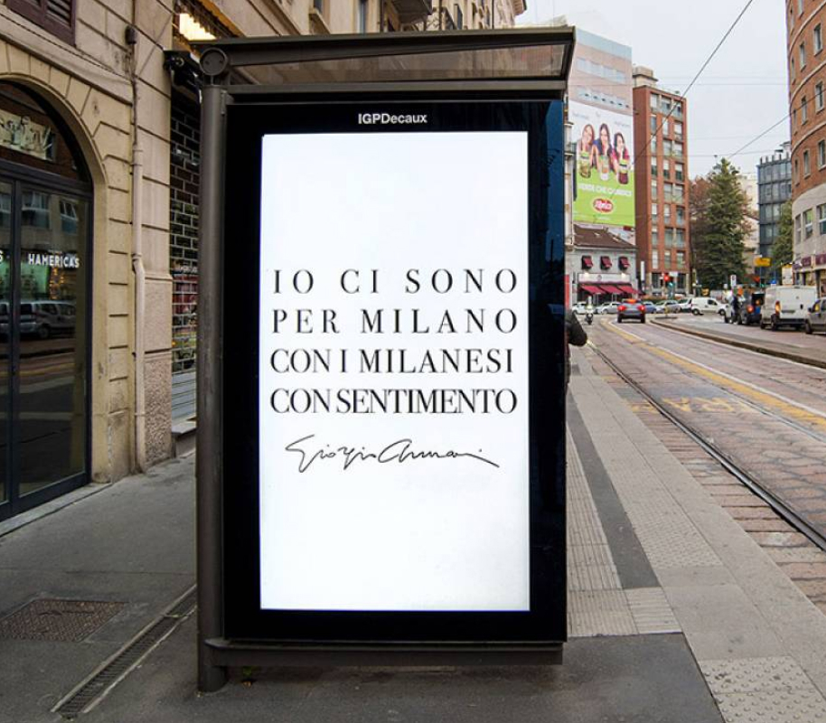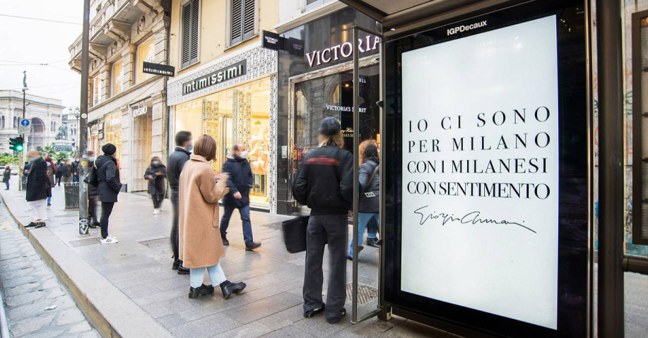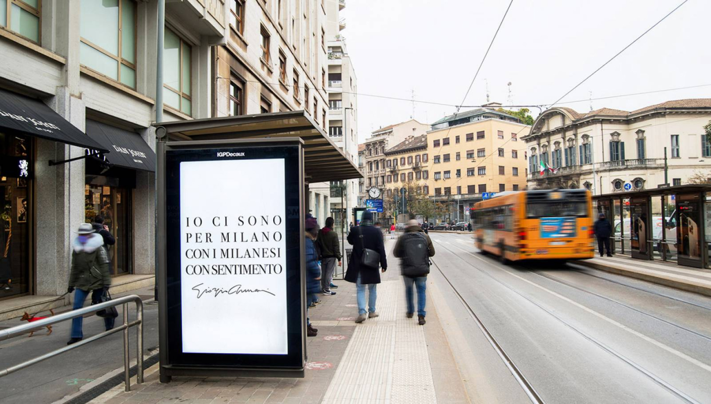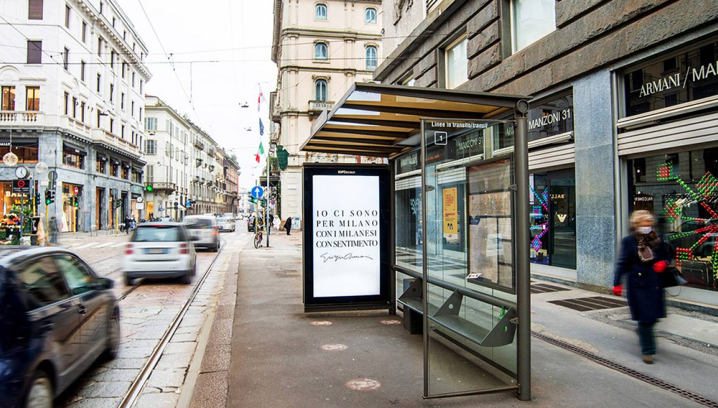 Giorgio Armani's message to the city of Milan on IGPDecaux shelters