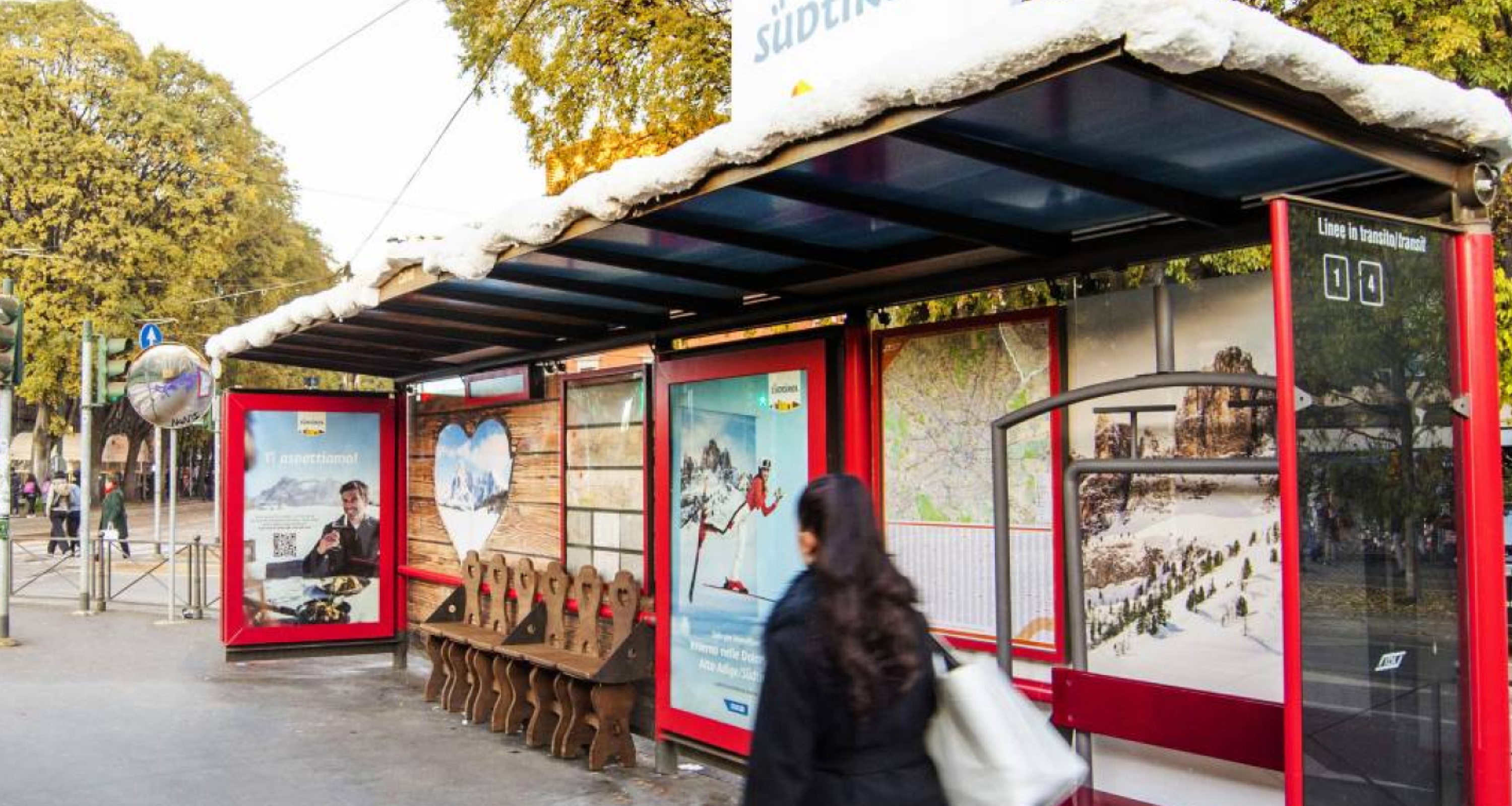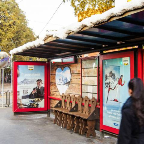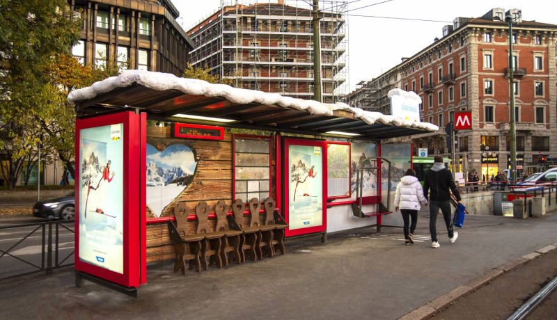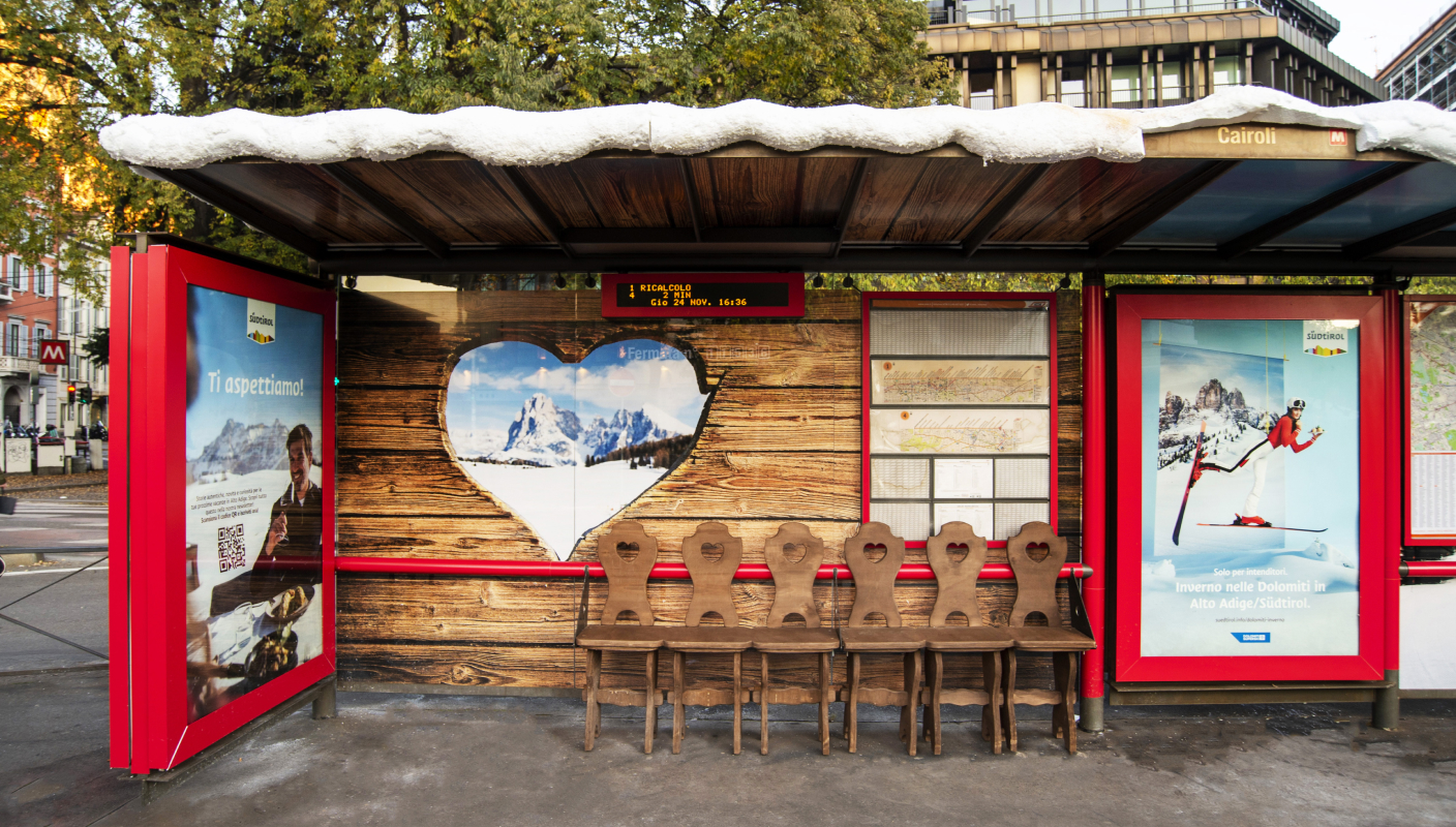 The campaign included a branded bus shelter in the vicinity of Largo Cairoli to push citizens and passers-by to discover the beauty of the territory of the South Tyrolean Dolomites. The classic seats of the urban furniture structure were replaced by a small chairlift, with the typical chairs of a mountain hut, supplemented by floor graphics simulating a pair of skis. The whole bus shelter was covered by a wonderful snow-covered roof with an illuminated sign.