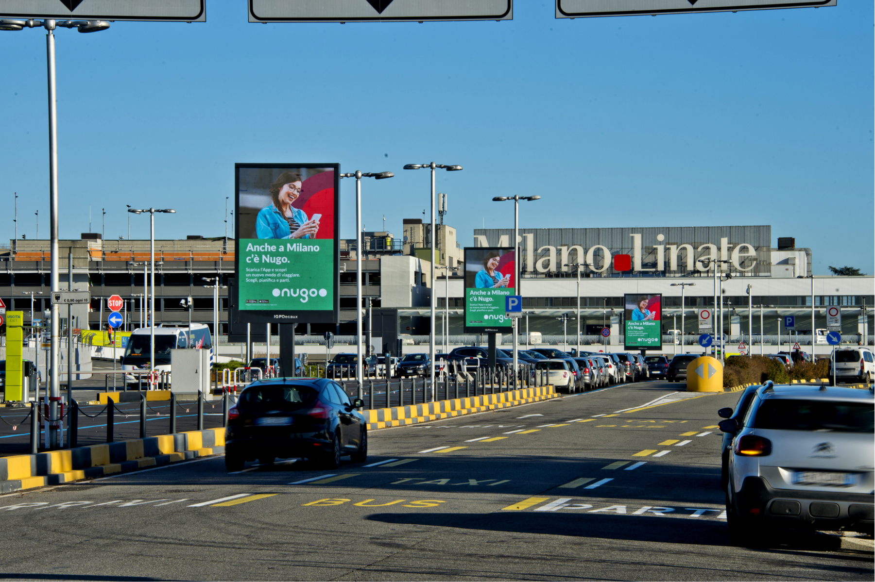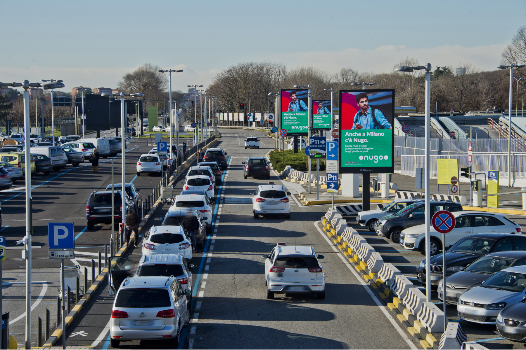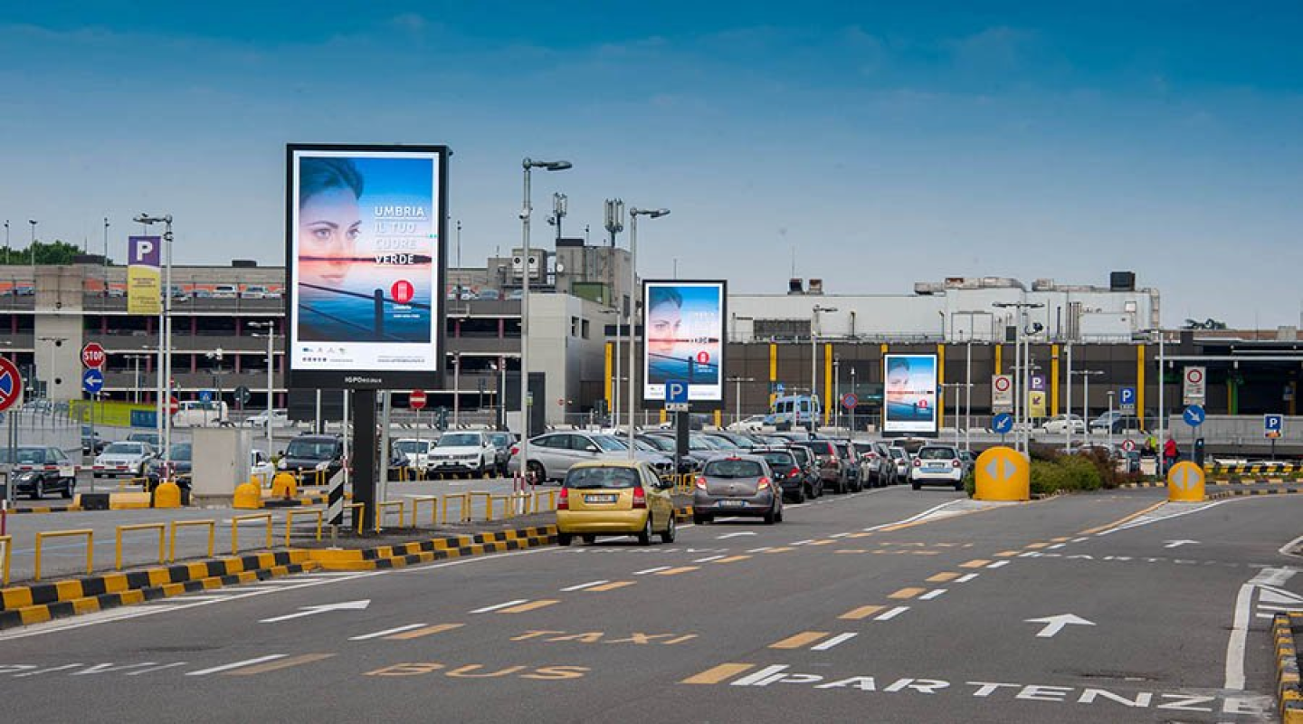 6 LED walls of 8 square metres installed at the external area of Linate airport. The size and technology of these solutions allow a display of the advertising message that ensures great visibility and impact also thanks to the synchronisation of the screens.