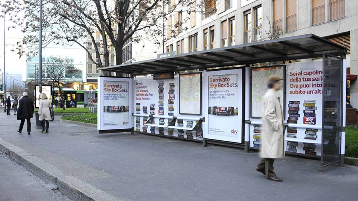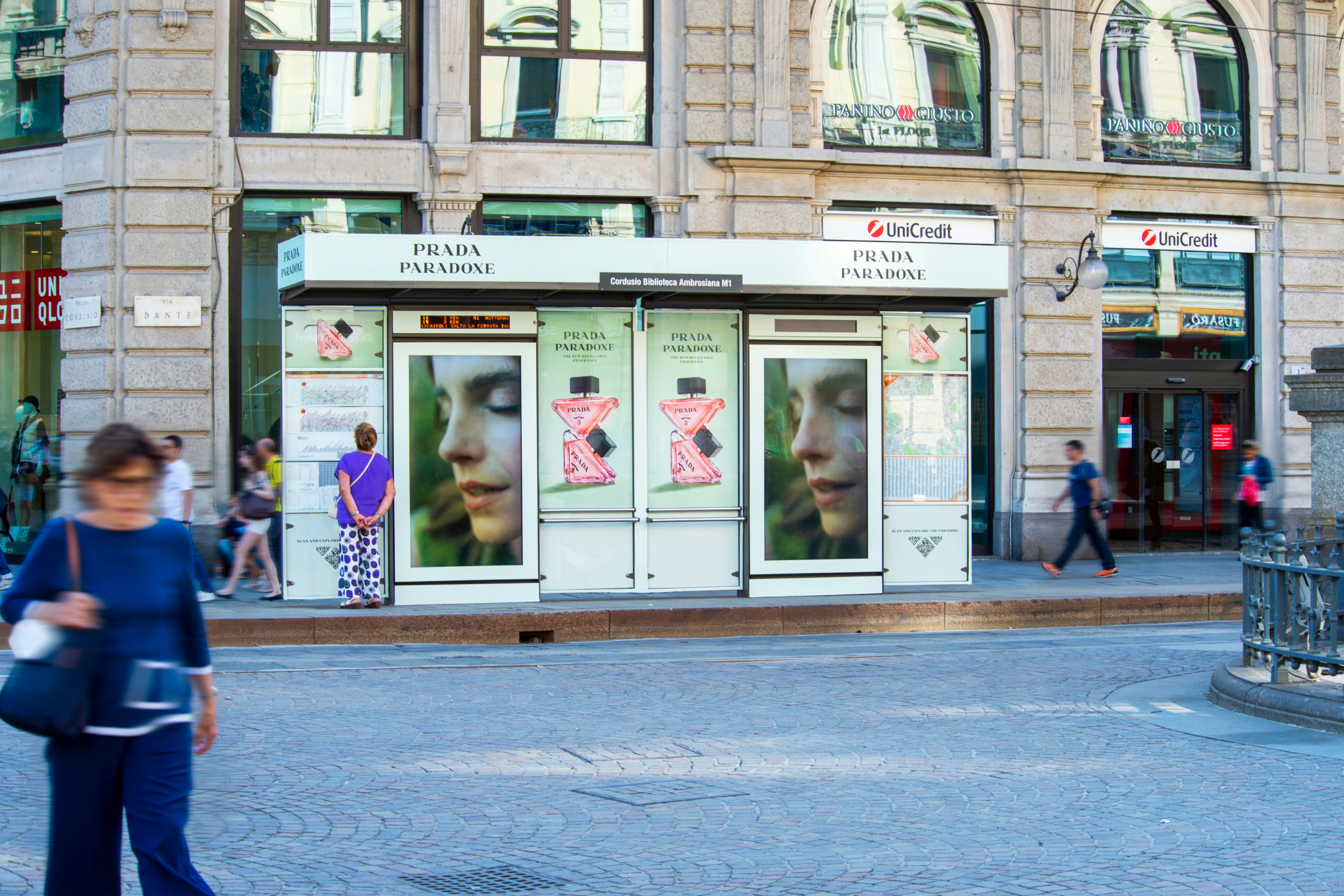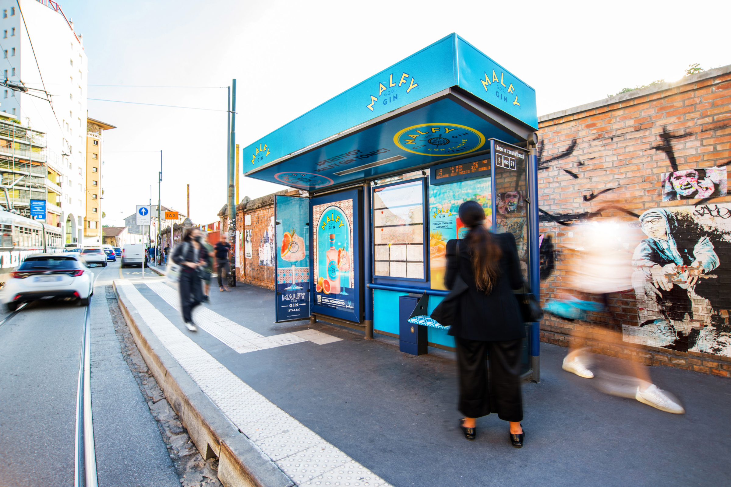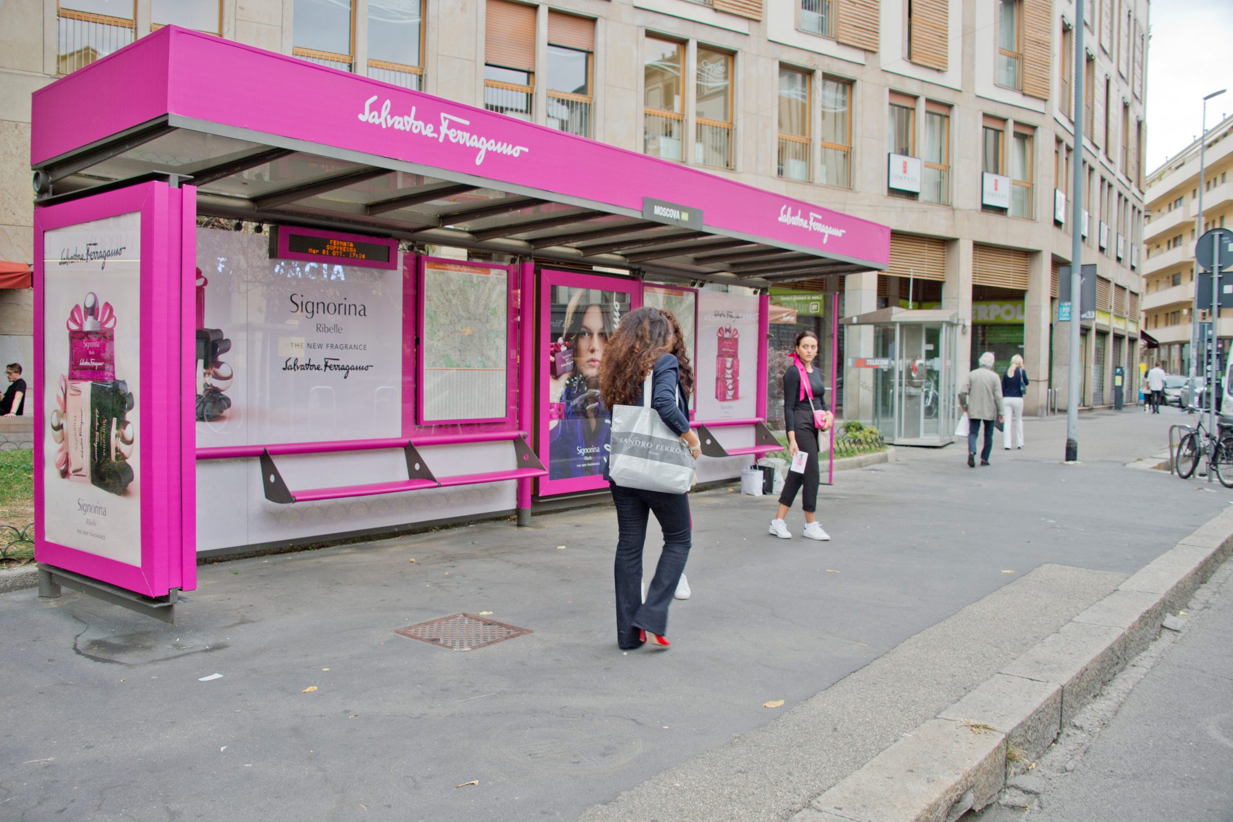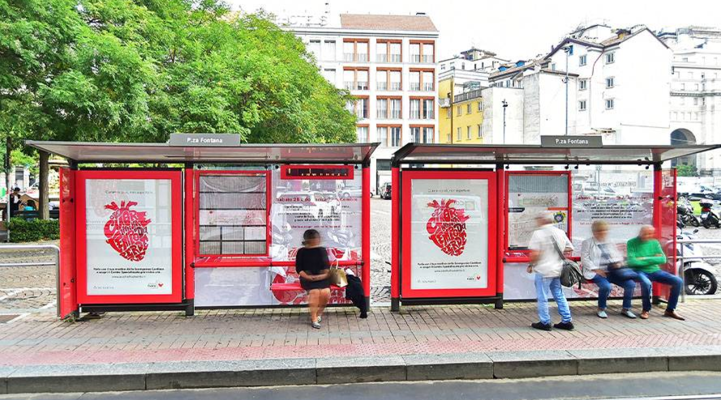 A totally immersive environment, designed to envelop users in a communication of great scenic impact, also with proposals of great creativity: a Brand Shelter represents a versatile customisation of the traditional street furniture system and can include the application of adhesive film on large areas of the shelter or on its entirety, the installation of monitors and sensors for an interactive experience, artistic and decorative works on roofs and floors, the display or distribution of products through showcases or dispensers, the organisation of promotional activities or sampling