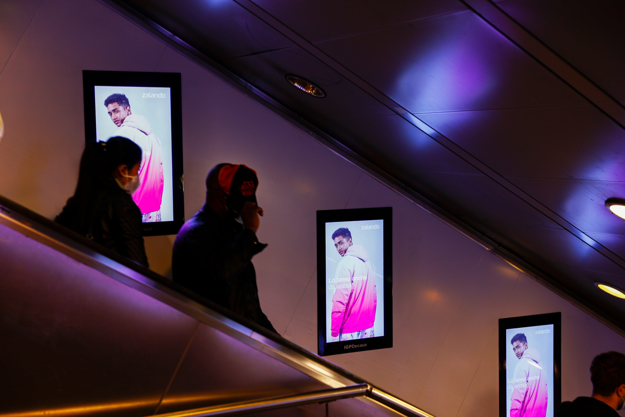 They extend prospectively into the tunnel and accompany people's gaze on the stairs. The optimal use of these facilities requires moving content that follows the flow. Therefore, videos and animations are recommended, preferably combined with full decoration of the wall behind.