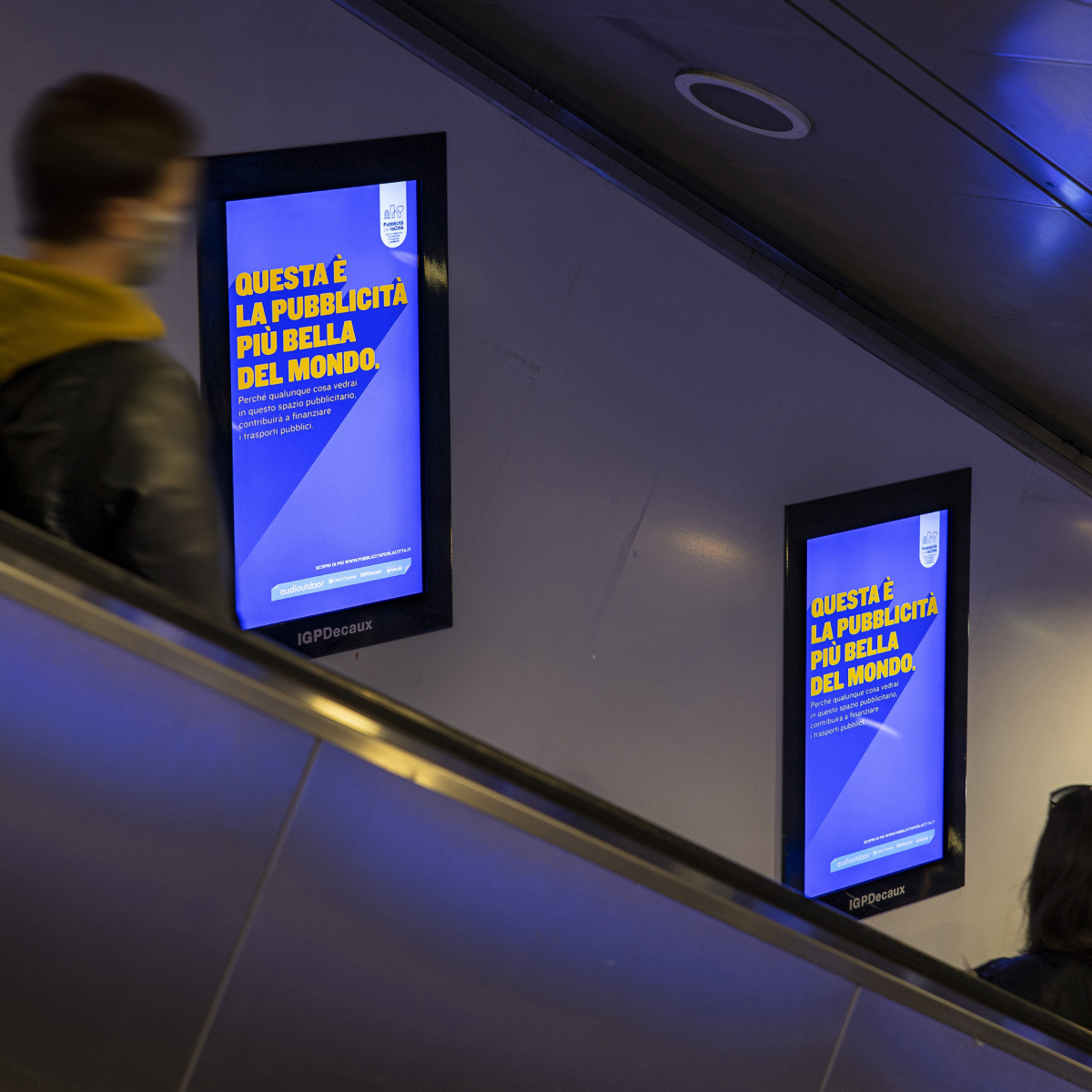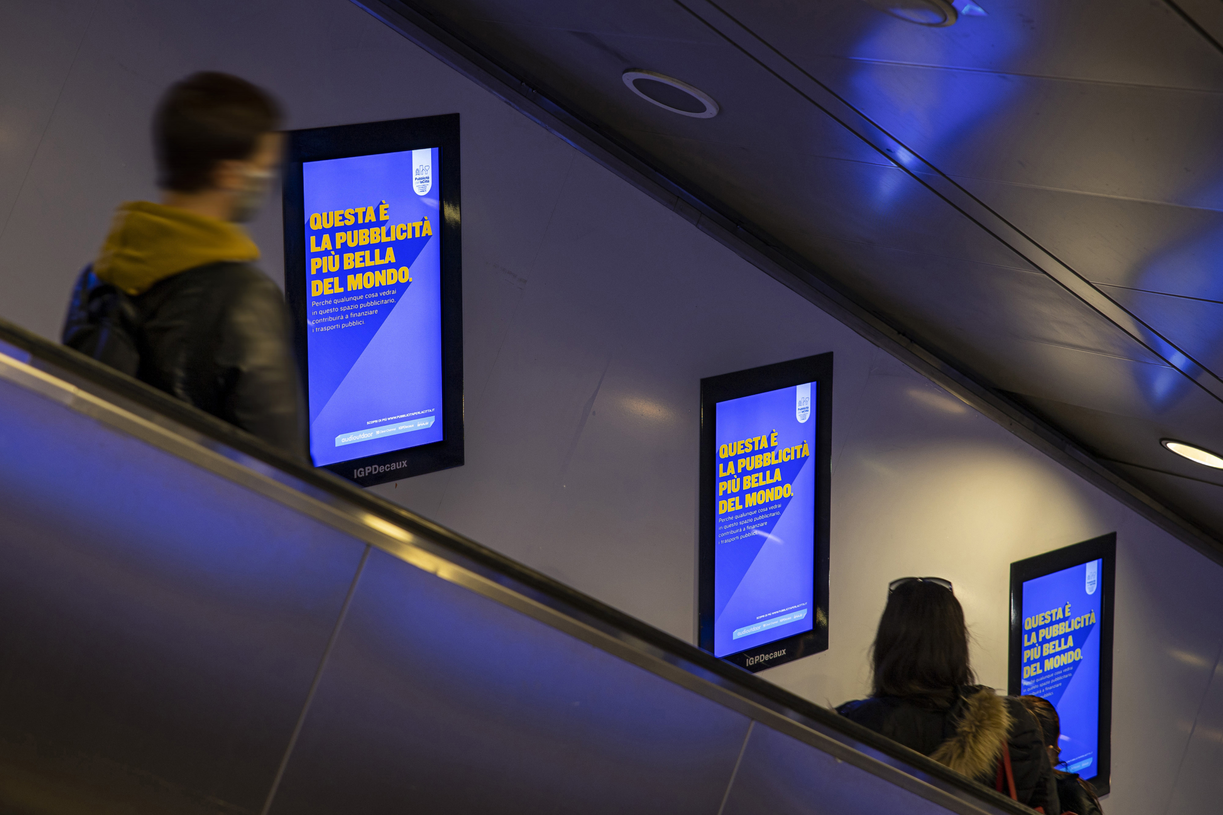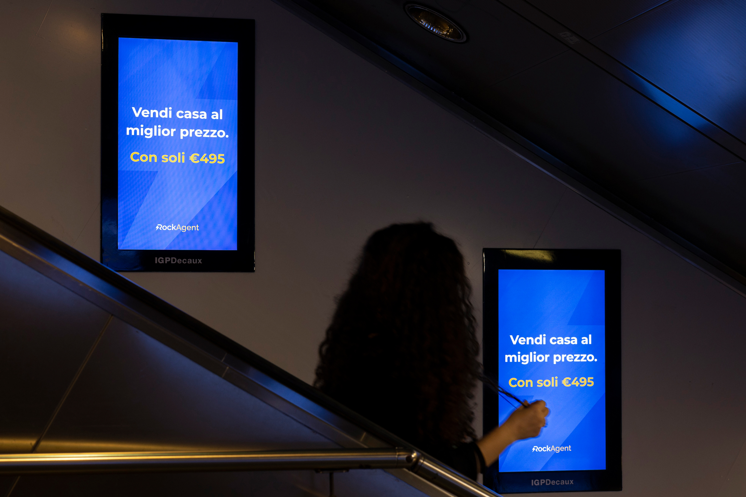 20 32-inch screens positioned on both sides of the busiest escalator in the Rome underground, the one located at Termini station, a nerve junction linking line A with line B that is very popular with Roman commuters.