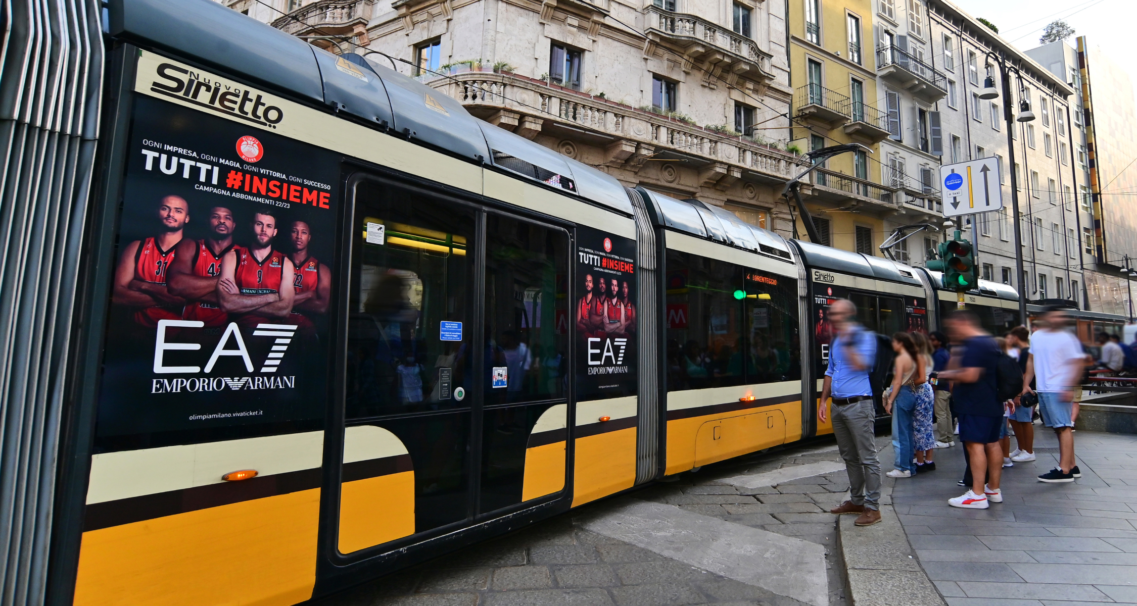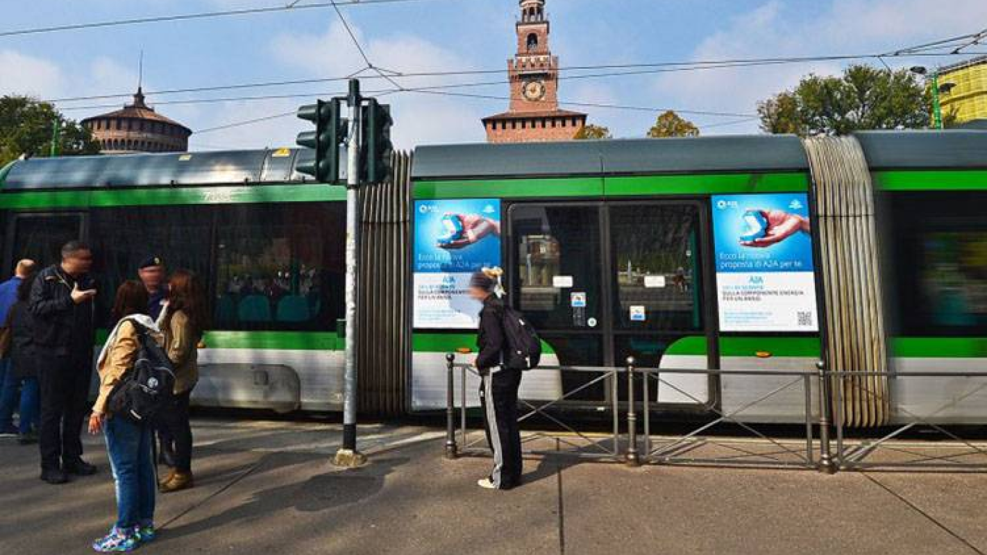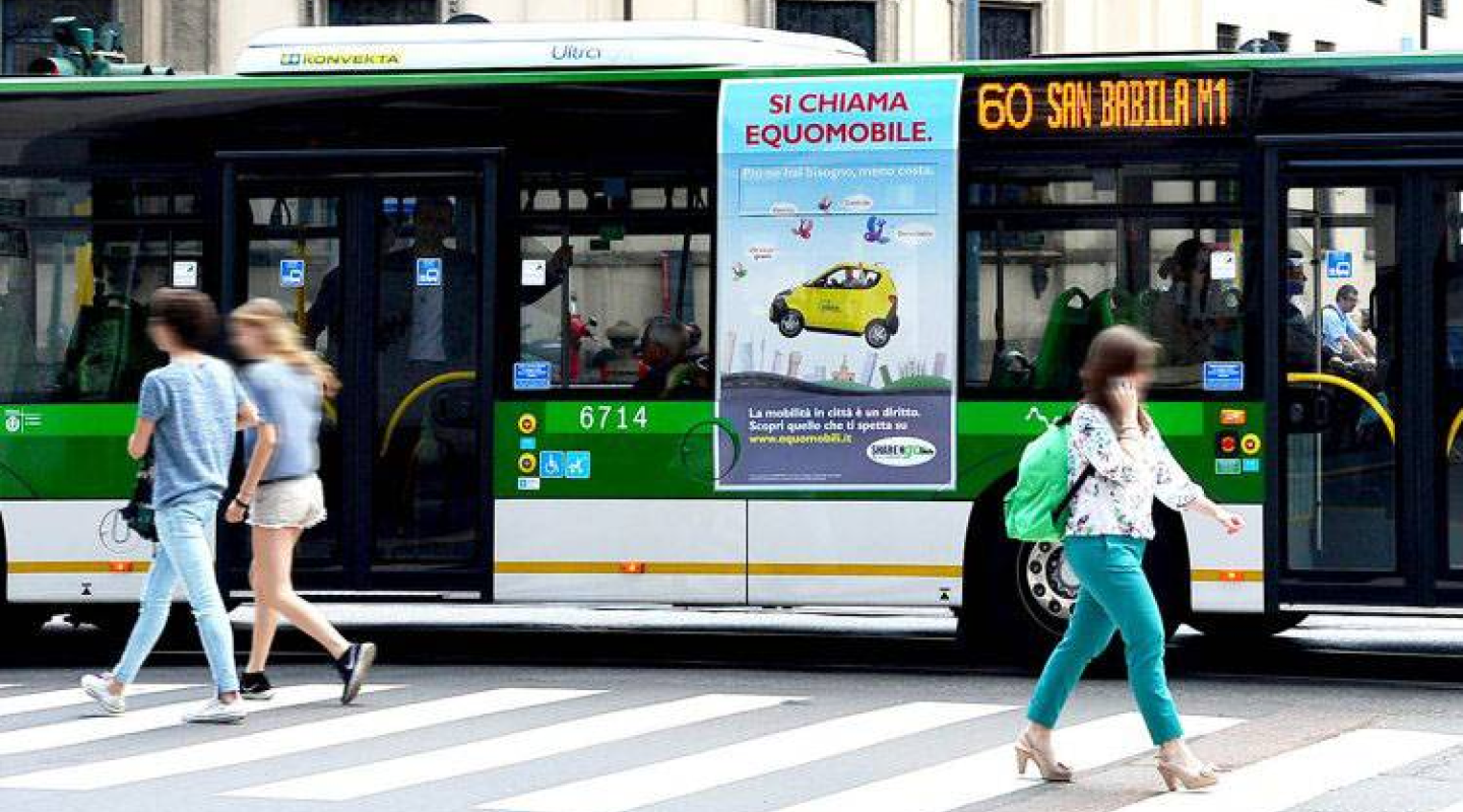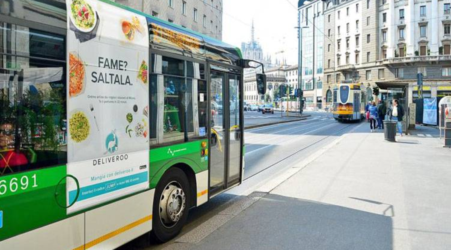 Partial decoration of the left side of buses and both sides of trams by applying a vertical format adhesive film.