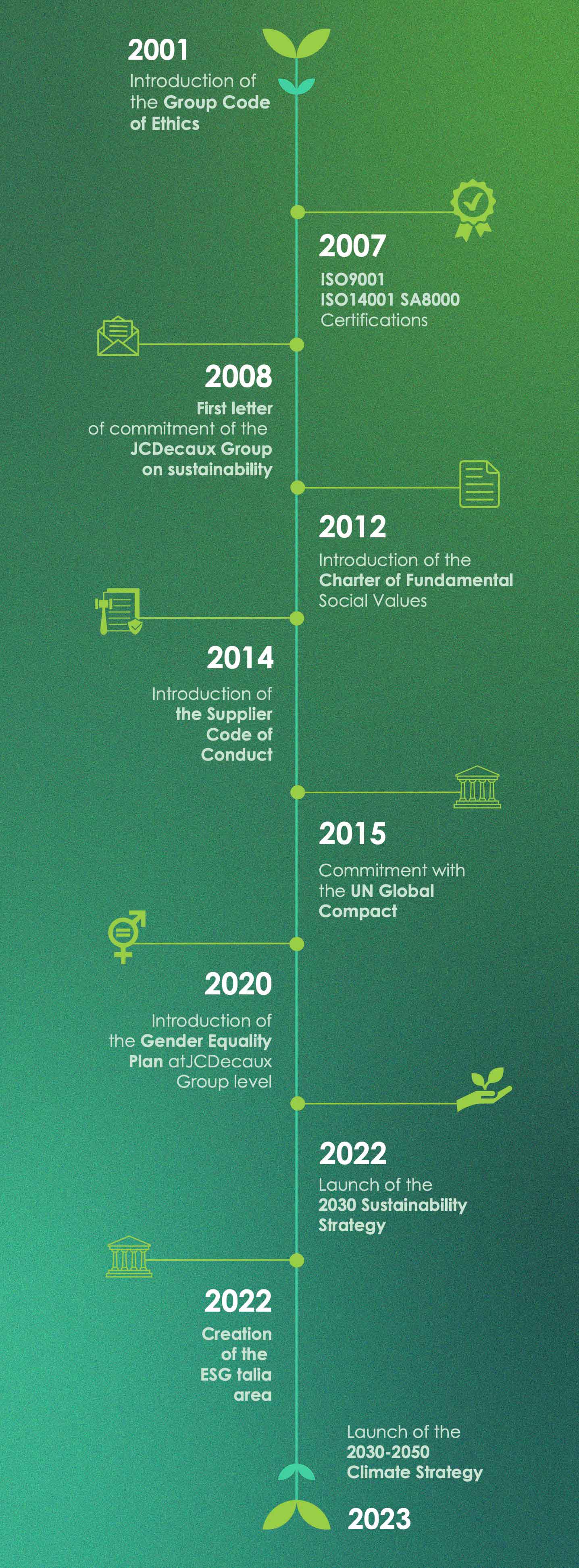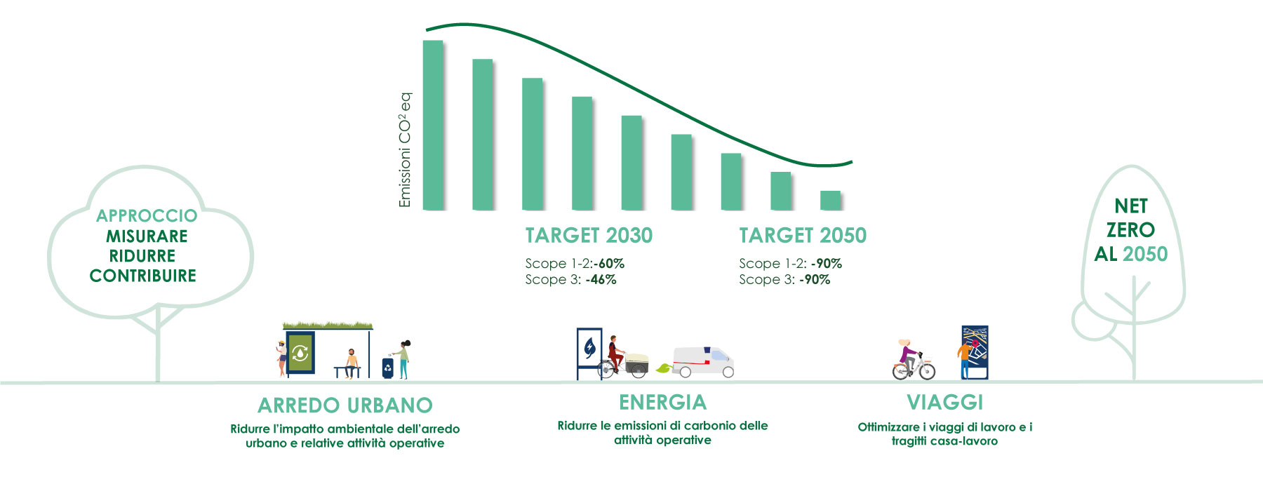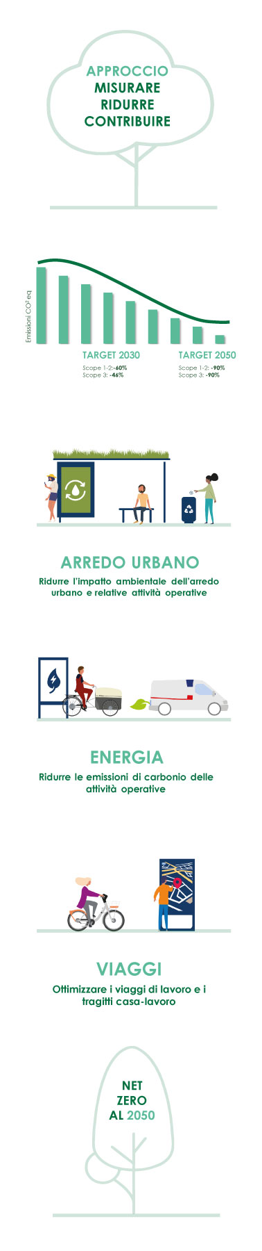 Per contribuire alla riduzione delle emissioni di carbonio e in risposta all’emergenza climatica, nel 2023 il Gruppo JCDecaux ha lanciato la sua Strategia Climatica, con il fine di contribuire attivamente alla Carbon Neutrality del pianeta ed arrivare al Net Zero Carbon entro il 2050, in linea con gli accordi i Parigi del 2015 e grazie ad una tabella di marcia basata sulla Science-Based Targets Initiative (SBTi), supportata da dati scientifici